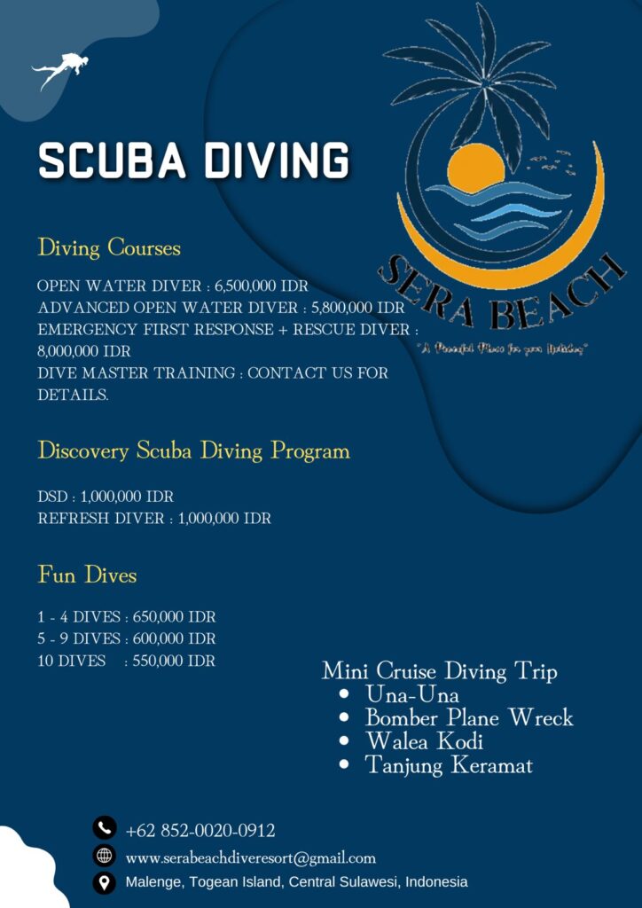 Sera Beach Dive Resort is located on Malenge Island in the heart of Togean National Park. The archipelago of 66 islands is a delightful mix of unspoiled jungle, golden beaches and extraordinary seabed. It’s the only place in Indonesia where the three types of reefs are grouped: atoll, coral reefs and fringing reefs.